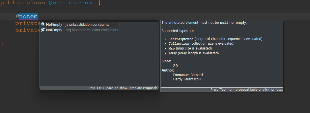 @NotEmpty(message = "내용을 입력하세요.")
