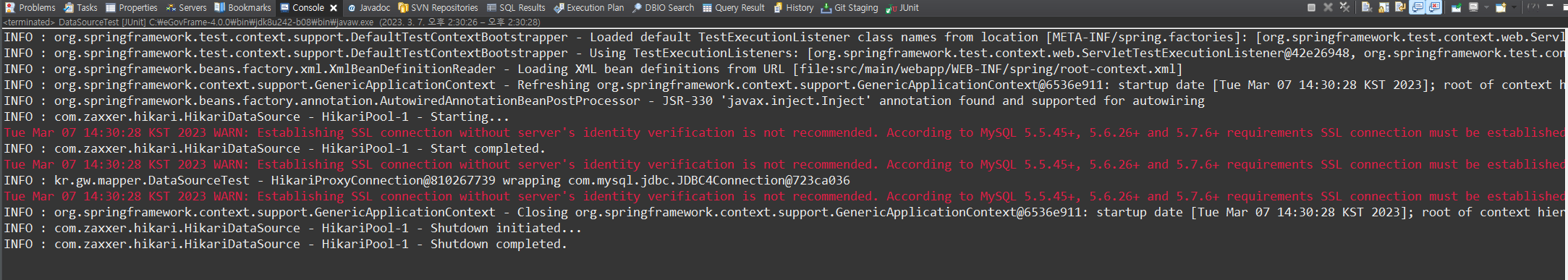 전자정부프레임워크 교육자료를 가지고 mysql 연결 테스트 과정에서 junit으로 테스트를 돌려보니 mysql 연동 문제에 관한 오류가 발생하였습니다.