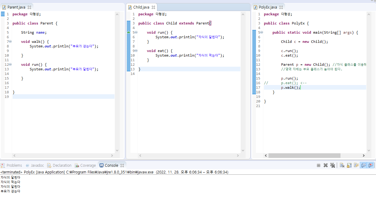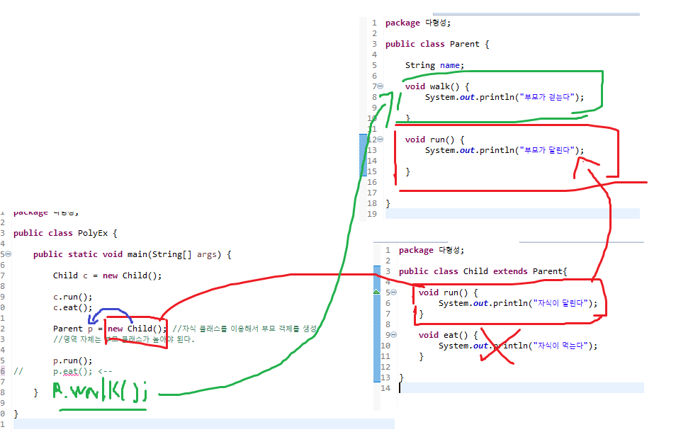 Parent p = new Child(); //자식 클래스를 이용해서 부모 객체를 생성